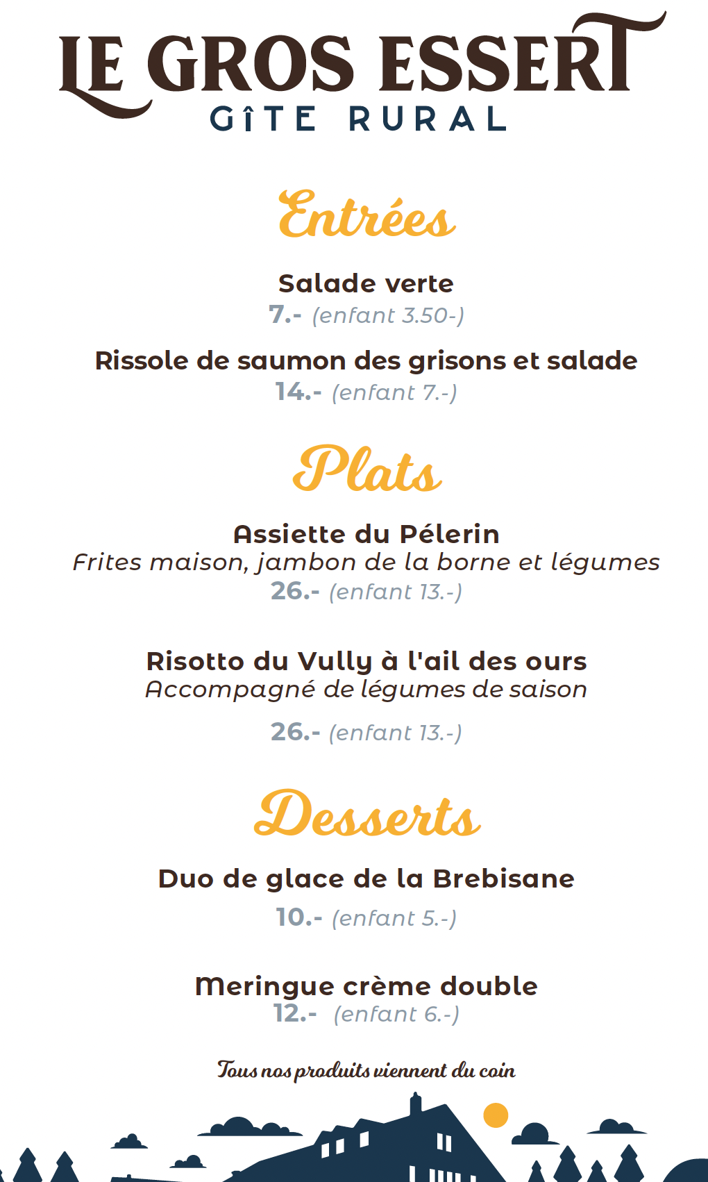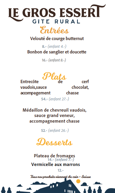 Réservation obligatoire par téléphone 026/652.35.38 ou par e-mail : legrosessert@bluewin.ch !